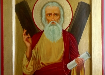 Живописная икона Святой Апостол Андрей Первозванный Размеры: Ширина 24 см. Высота 30 см, Толщина 2,5 см.
