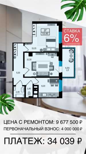 Тип объявления: Продам; Вид объекта: Новострой; Количество комнат: 2; Тип дома: Монолитный; Площадь: 54; Этаж: 15; Этажей в доме: 20;