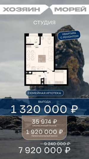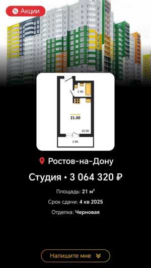 Тип объявления: Продам; Вид объекта: Новострой; Площадь: 20; Этаж: 2; Этажей в доме: 12;