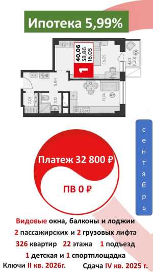 Тип объявления: Продам; Вид объекта: Новострой; Количество комнат: 1; Тип дома: Монолитный; Площадь: 40; Этаж: 4; Этажей в доме: 25;